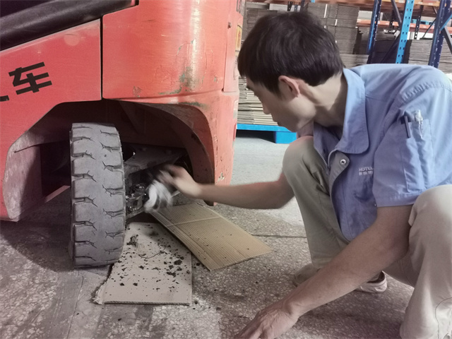 嘗到改變帶來(lái)工作便利的劉師傅,同樣對(duì)自己的“愛(ài)車”——叉車也是呵護(hù)有加,如何保養(yǎng)?怎樣維修都有精確的要求,他會(huì)每天除塵保養(yǎng)、半月加注潤(rùn)滑、45天左右加一次黃油,特別是當(dāng)下的高溫天氣,他每天最關(guān)注叉車的蒸餾水盈虧情況?!耙坏┌l(fā)生缺水,就會(huì)減少電池的使用壽命,這方面最容易導(dǎo)致叉車受損壞!”劉宗苗對(duì)此特別強(qiáng)調(diào)。在保養(yǎng)中,還發(fā)生過(guò)一個(gè)小插曲,擁有叉車豐富保養(yǎng)經(jīng)驗(yàn)的他,有一次在咨詢外協(xié)單位師傅如何保養(yǎng)叉車底盤(pán)的黃油嘴時(shí),那位師傅竟然一時(shí)沒(méi)有找到這個(gè)很重要的部位!