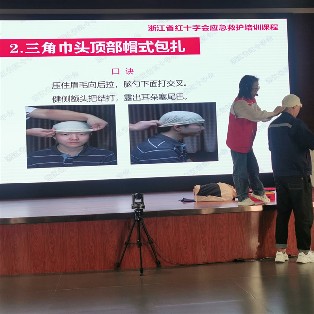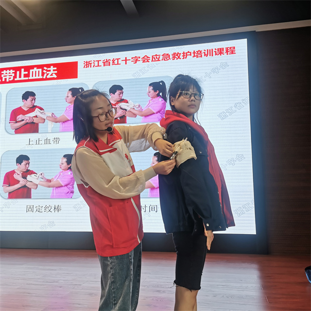 丁老師向大家講解了紅十字運動基本知識、應(yīng)急救護概論、心肺復蘇理論與實操、AED的使用及注意事項、氣道異物梗阻、創(chuàng)傷救護概論及四大技術(shù)“止血、包扎、骨折、搬運”,對一些相關(guān)救護操作要領(lǐng)進行了現(xiàn)場示范操作。